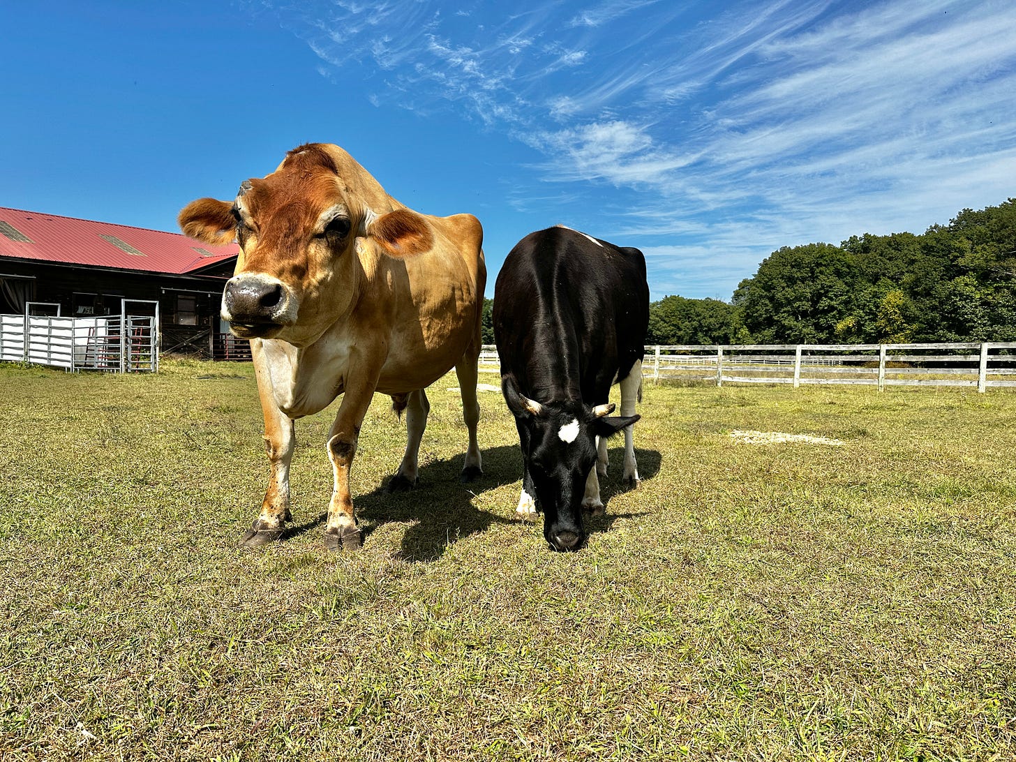 Franklin and Ruthie took their time exploring their new pasture and stall, locating the water troughs, and finding the best spots to graze. They seemed comfortable right away, despite the brand new surroundings. Slowly, other cows started coming up to the fences and greeting them. We are not sure which group these two will join, but they’re doing really well settling in!